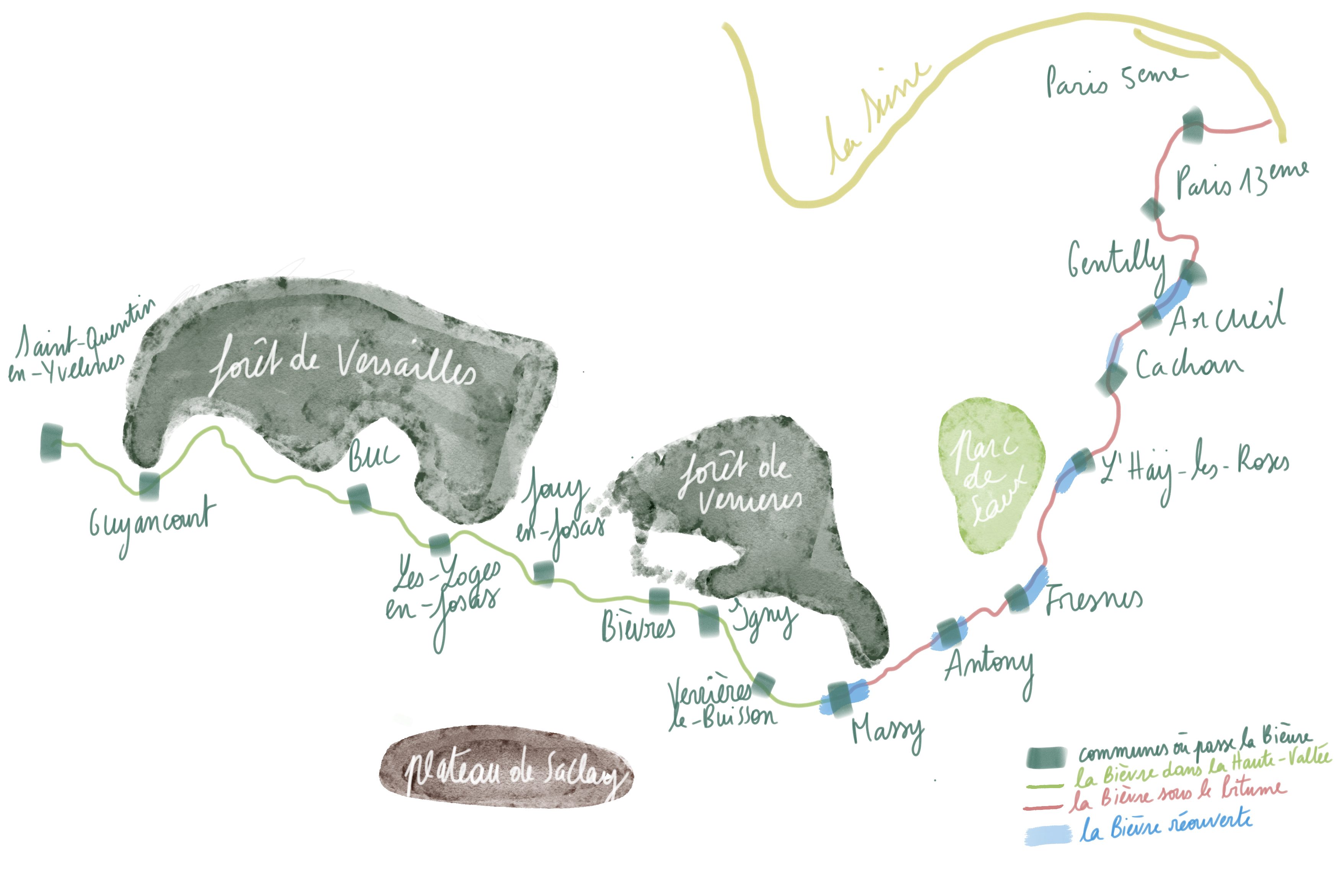 La Bièvre est sans doute la rivière urbaine la plus connue de ces rivières méconnues. Elle prend sa source à Guyancourt, et se jette historiquement dans la Seine, au niveau de la gare d’Austerlitz, après un parcours de 35 kilomètres.